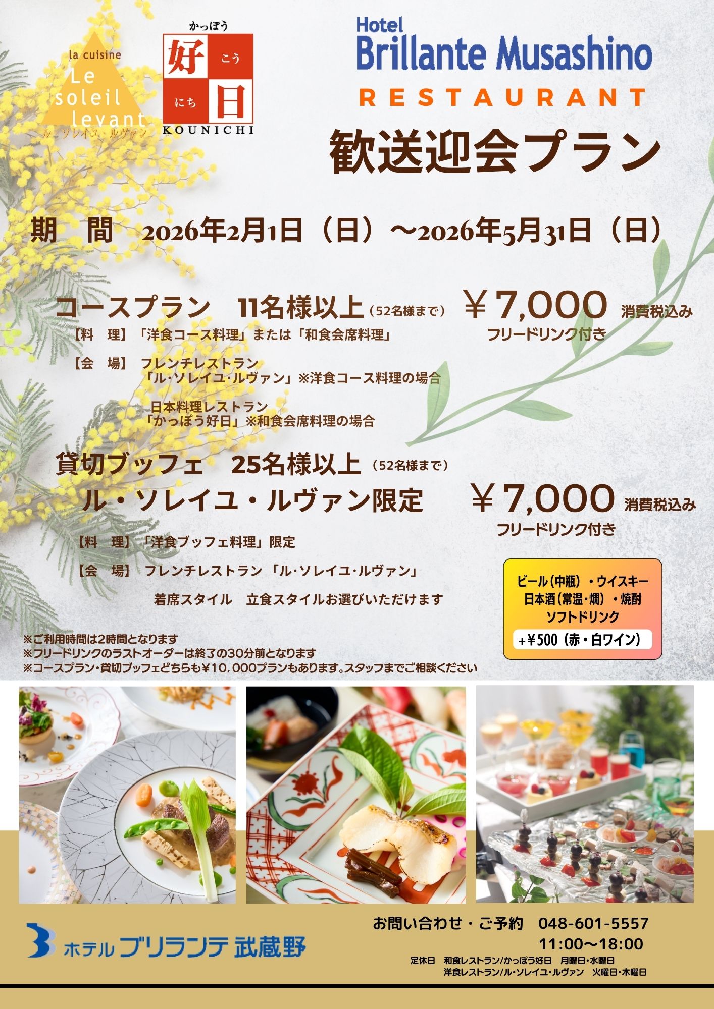 ランチ: 11:30~14:30(ラストオーダー14:00) ディナー: 17:30〜21:00(ドリンクラストオーダー20:30) ※ディナーは木・金・土の営業とさせていただきます。3日前までにご予約をお願いいたします。 店休日:月曜日・水曜日 |